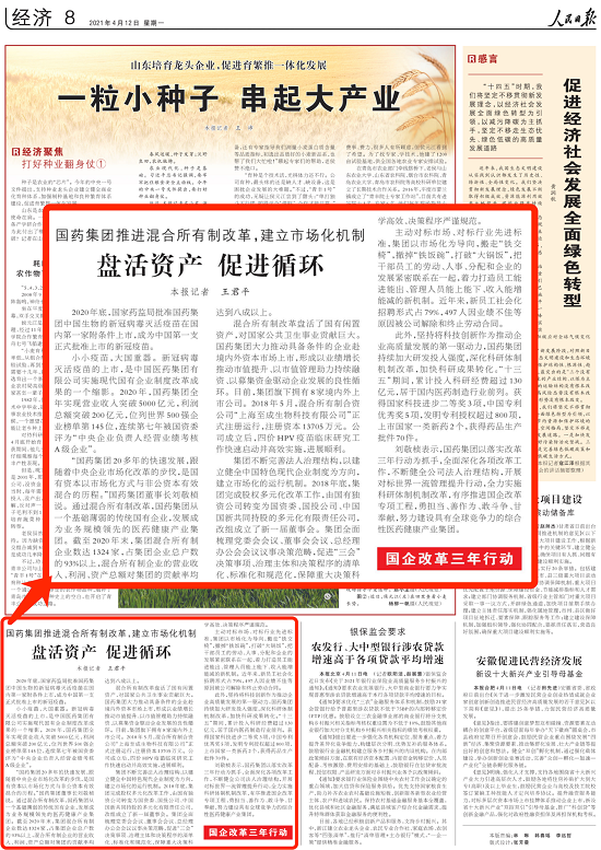 小小疫苗,大國重器。新冠病毒滅活疫苗的上市,是中國醫(yī)藥集團有限公司實施現(xiàn)代國有企業(yè)制度改革成果的一個縮影。2020年,國藥集團全年實現(xiàn)營業(yè)收入突破5000億元,利潤總額突破200億元,位列世界500強企業(yè)榜單第145位,連續(xù)第七年被國資委評為“中央企業(yè)負責人經(jīng)營業(yè)績考核A級企業(yè)”。